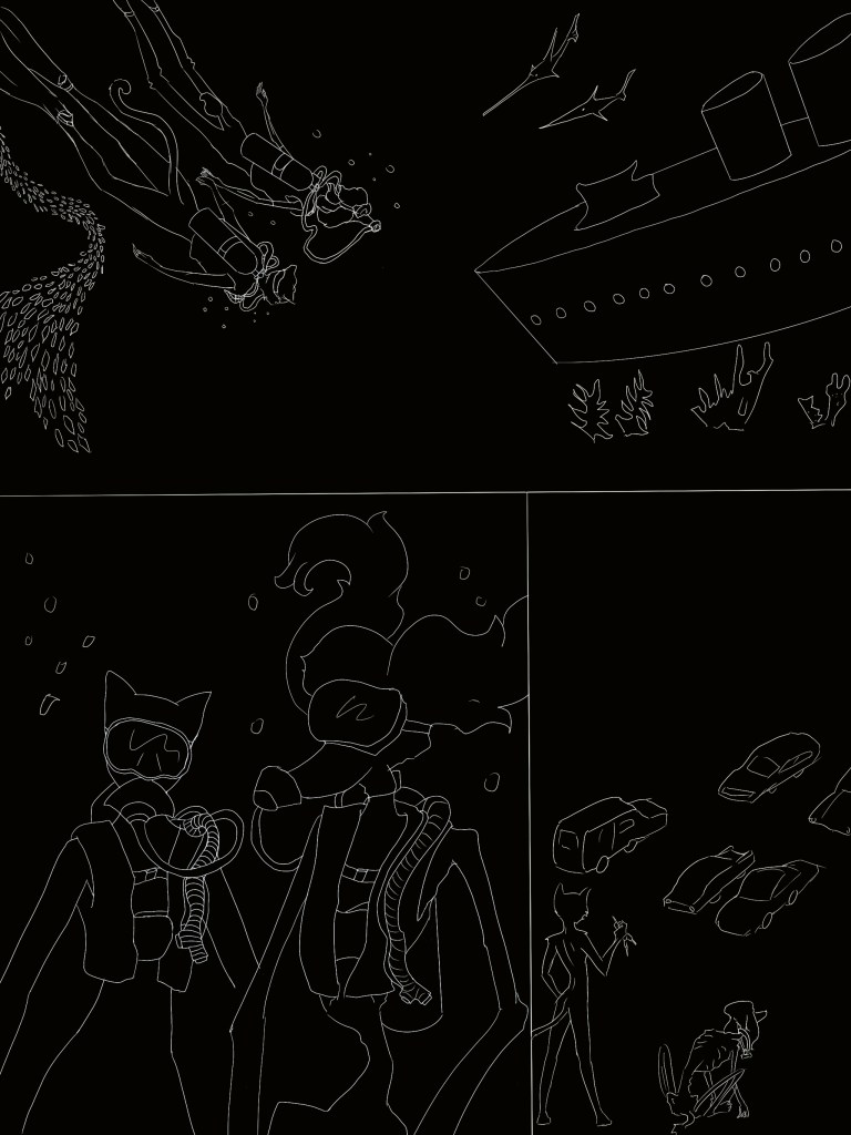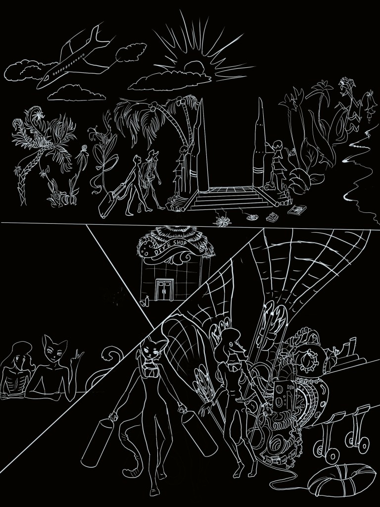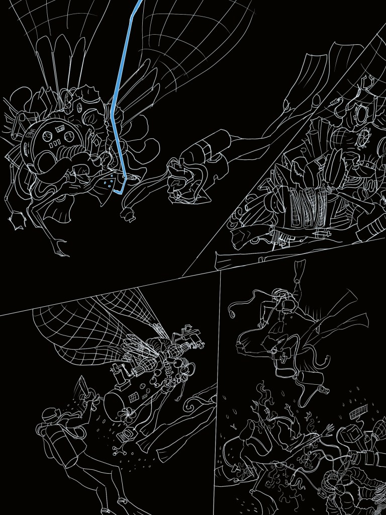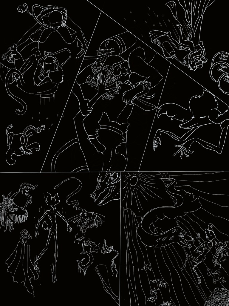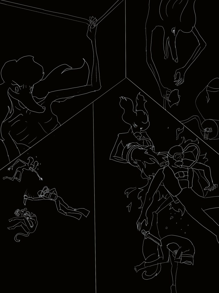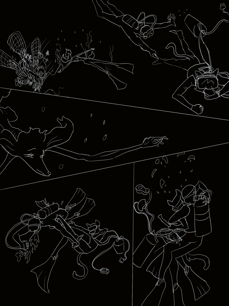 The diver catches up to minerva. Minerva uses the coral and wildlife around her as a weapon, trying to kick him to induce vomiting while keeping her vital equipment away from the diver’s knife. Minerva loses her fins, the diver approaches her and she tries to ram the tank into his gut while creating distance between her center and the knife. He can’t get a good stab so he grabs on to her and the tank then empties his BCD. They begin descending quickly. Minerva loses grip of the tank. She struggles, but she knew letting go of the tank in this position meant a certain death.