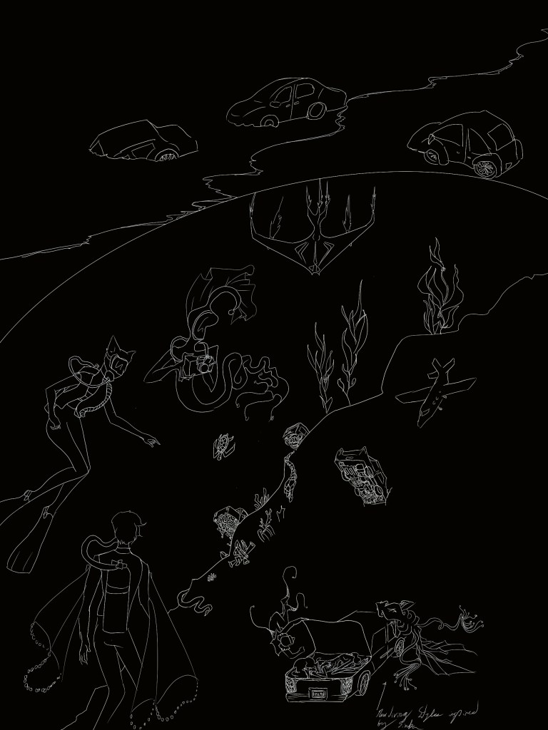 With a carelessness that only comes from knowing Simba’s unfailing pattern of revival, Minerva left Simba in the trunk of one of the cars before driving it into the ocean to become part of her underwater car wreck exhibit. She knew he’d revive himself one way or another, and liven her work. She watched as he sunk to the bottom. She counted the minutes, guessing he was blacked out after 3. She tried to replicate the existential last thoughts he was having, childhood memories, vendettas, the most candid words he’s ever heard from someone,, and then the final relinquishing of will to live before surrendering to his godlike self. Two of the divers miraculously found and freed him. SImba rose like an angel to the now heavenly light at the ocean surface. His dead crinkled body unraveled and stretched. He breached the surface for his breath of life, every muscle flexed, sun glowing for him. Minerva smiled and then swam up to call it a day and get some coffee.