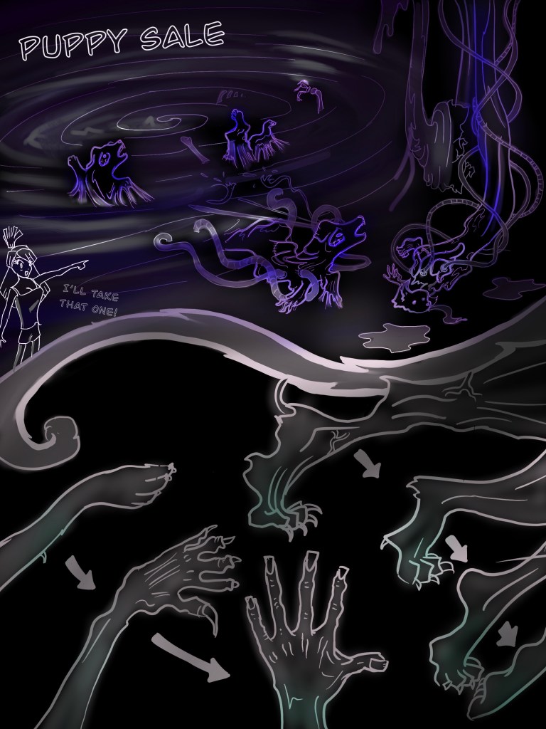 Note: These comics started from me anthropomorphizing my childhood pets. I guess they're a genetically engineered dog breed that turn in to humanoids and back. This picture depicts what selecting a Puppy from that mutant litter would look like.